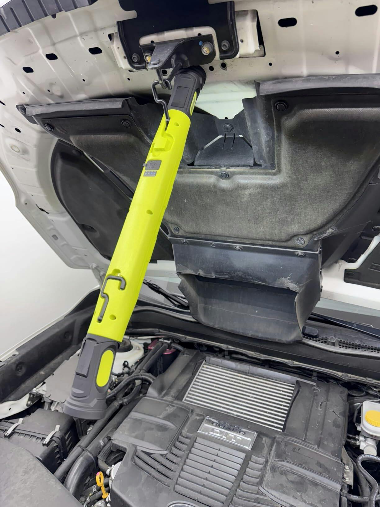 Om din motorhuv är av aluminium eller glasfiber kan du använda de inbyggda, roterbara krokarna för att hänga lampan säkert — kunder med aluminiumhuv bekräftar att detta fungerar utmärkt.